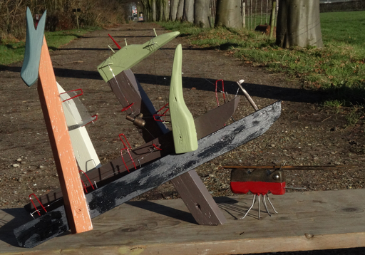 In a next artwork, thin wooden sticks will be connected and used as support for complex bodies (wood, metal) that may get cover of a wired mesh. At juxtaposition – at the same level or above -, pieces of glass may be placed. The latter, if put under (sun)light, will present yet another dimension by reflection of parts of the environment. As such, this environment adds to the multi-facetted dimensions in the complete composition.