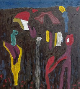 "If it's true / that downfall of some elements / may bestow us with good nature / and spirit, / then / let heaven's gates open..." (painting on carton, on board, with wooden frame intrinsic part)