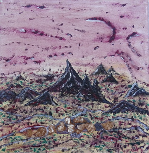 "The landscape is disquiet / in its being / in its not being, / in what shall come, / in the ineluctability, / in the many voids" (mixed media on cotton on panel)