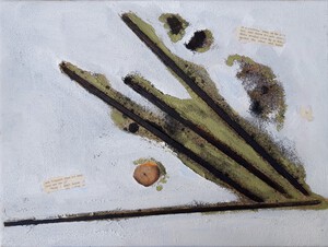 Note these are rumors / which may be unfounded." (mixed media, paint, ink, ashes, image 8.5x16 cm)