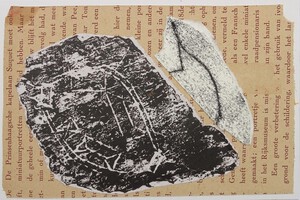 (lino-cut over fragments of book, size image 16x21 cm, unique)