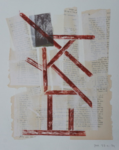 2022monoprint on old text, part of 'mailart' project title "Kloster / Cloister", exposition in Museum Schloss Zehdenick, Germany, June 2022